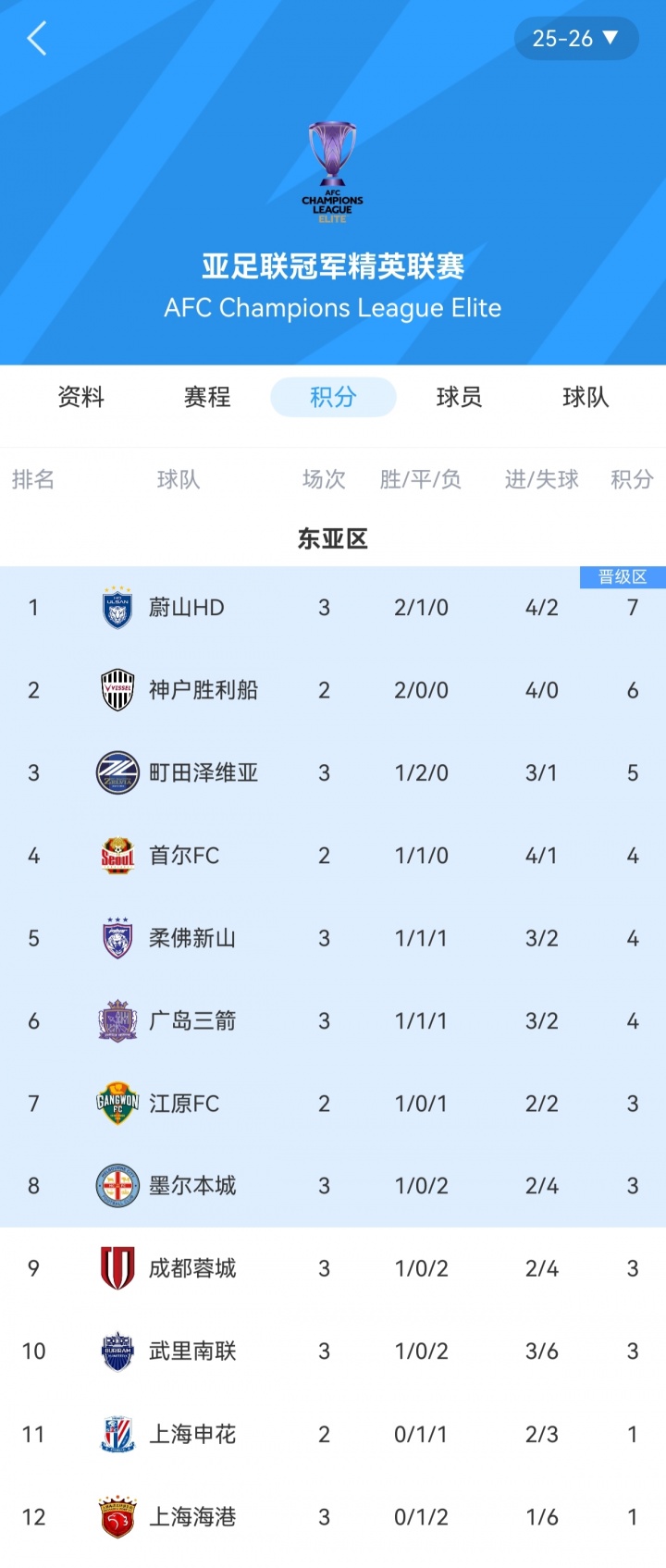 亚冠东亚区积分榜:海港3轮1分排名垫底,蓉城3分暂列第9