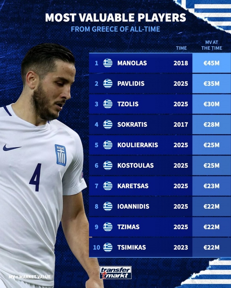 希腊球员历史身价排名:马诺拉斯4500万欧居首,帕夫利季斯次席