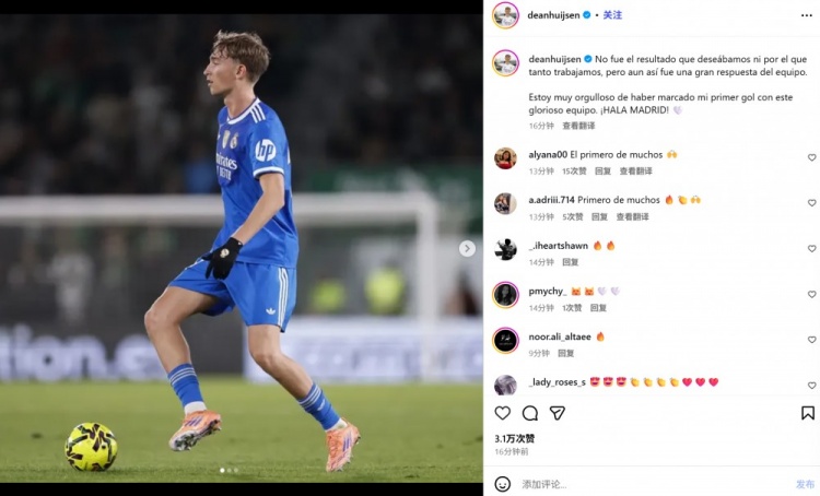 赫伊森社媒:平局并非我们想要的结果 很荣幸打进皇马处子球