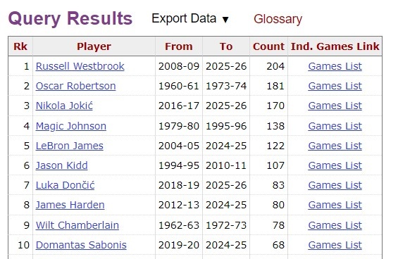 根据数据统计,这是哈登职业生涯第81个三双,他继续排在NBA历史三双榜第8。