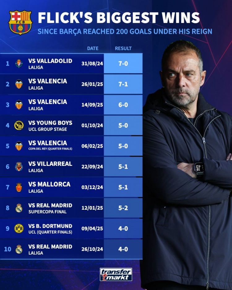 弗里克执教巴萨最大胜利:7-0巴拉多利德居首,5-2、4-0皇马在列